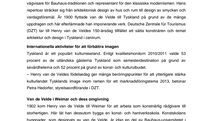 – Henry van de Veldes födelsedag ger många beröringspunkter för att ytterligare stärka kulturlandet Tysklands image inom ramen för ett marknadsföringstema 2013, betonar Petra Hedorfer, styrelseordförande i DZT.