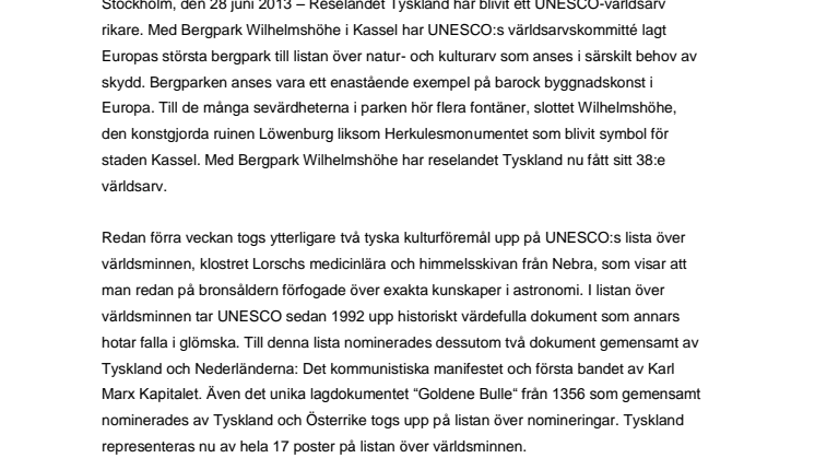 Redan förra veckan togs ytterligare två tyska kulturföremål upp på UNESCO:s lista över världsminnen, klostret Lorschs medicinlära och himmelsskivan från Nebra, som visar att man redan på bronsåldern förfogade över exakta kunskaper i astronomi. I listan över världsminnen tar UNESCO sedan 1992 upp historiskt värdefulla dokument som annars hotar falla i glömska. Till denna lista nominerades dessutom två dokument gemensamt av Tyskland och Nederländerna: Det kommunistiska manifestet och första bandet av Karl Marx Kapitalet. Även det unika lagdokumentet “Goldene Bulle“ från 1356 som gemensamt nominerades av Tyskland och Österrike togs upp på listan över nomineringar. Tyskland representeras nu av hela 17 poster på listan över världsminnen.