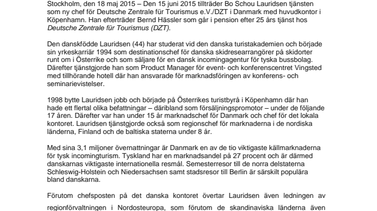 Den 15 juni 2015 tillträder Bo Schou Lauridsen tjänsten som ny chef för Deutsche Zentrale für Tourismus e.V./DZT i Danmark med huvudkontor i Köpenhamn. Han efterträder Bernd Hässler som går i pension efter 25 års tjänst hos Deutsche Zentrale für Tourismus (DZT).