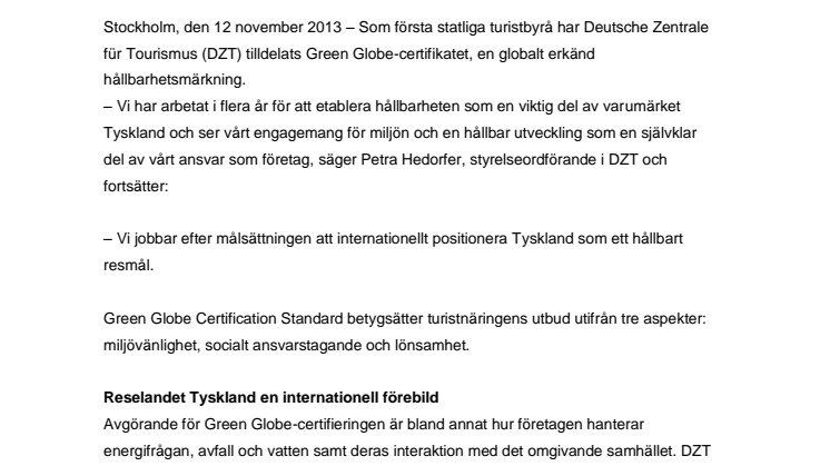 turistbyrå har Deutsche Zentrale für Tourismus (DZT) tilldelats Green Globe-certifikatet, en globalt erkänd hållbarhetsmärkning.