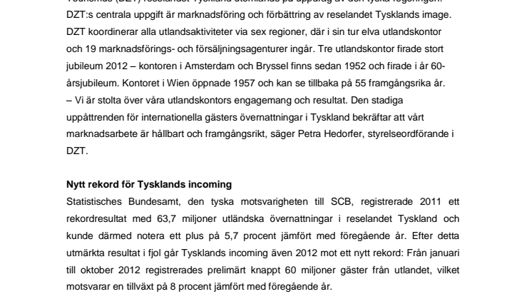 Statistisches Bundesamt, den tyska motsvarigheten till SCB, registrerade 2011 ett rekordresultat med 63,7 miljoner utländska övernattningar i reselandet Tyskland och kunde därmed notera ett plus på 5,7 procent jämfört med föregående år. Efter detta utmärkta resultat i fjol går Tysklands incoming även 2012 mot ett nytt rekord: Från januari till oktober 2012 registrerades prelimärt knappt 60 miljoner gäster från utlandet, vilket motsvarar en tillväxt på 8 procent jämfört med föregående år.