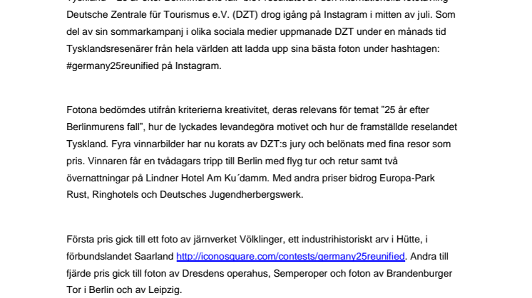 Fler än 4000 foton på temat “Min sommarsemester i Tyskland – 25 år efter Berlinmurens fall” blev resultatet av den internationella fototävling Deutsche Zentrale für Tourismus e.V. (DZT) drog igång på Instagram i mitten av juli. Som del av sin sommarkampanj i olika sociala medier uppmanade DZT under en månads tid Tysklandsresenärer från hela världen att ladda upp sina bästa foton under hashtagen: #germany25reunified på Instagram.