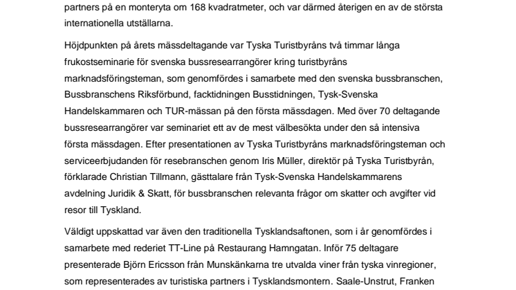 Höjdpunkten på årets mässdeltagande var Tyska Turistbyråns två timmar långa frukostseminarie för svenska bussresearrangörer kring turistbyråns marknadsföringsteman, som genomfördes i samarbete med den svenska bussbranschen, Bussbranschens Riksförbund, facktidningen Busstidningen, Tysk-Svenska Handelskammaren och TUR-mässan på den första mässdagen. Med över 70 deltagande bussresearrangörer var seminariet ett av de mest välbesökta under den så intensiva första mässdagen. Efter presentationen av Tyska Turistbyråns marknadsföringsteman och serviceerbjudanden för resebranschen genom Iris Müller, direktör på Tyska Turistbyrån, förklarade Christian Tillmann, gästtalare från Tysk-Svenska Handelskammarens avdelning Juridik & Skatt, för bussbranschen relevanta frågor om skatter och avgifter vid resor till Tyskland.