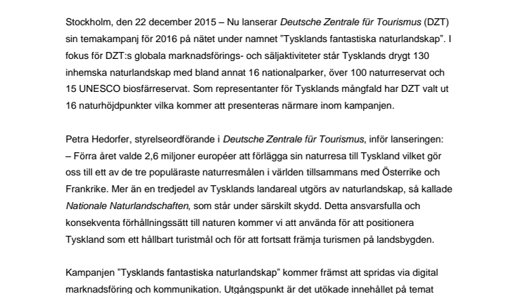 Nu lanserar Deutsche Zentrale für Tourismus (DZT) sin temakampanj för 2016 på nätet under namnet ”Tysklands fantastiska naturlandskap”. I fokus för DZT:s globala marknadsförings- och säljaktiviteter står Tysklands drygt 130 inhemska naturlandskap med bland annat 16 nationalparker, över 100 naturreservat och 15 UNESCO biosfärreservat. Som representanter för Tysklands mångfald har DZT valt ut 16 naturhöjdpunkter vilka kommer att presenteras närmare inom kampanjen.