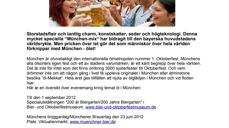 München är otvivelaktigt den internationella ölmetropolen nummer 1. Oktoberfest, Münchens alla ölsorters egen fest och ett av stadens varumärken, är ett känt begrepp över hela världen. Det är inte för intet som det finns omkring 3000 systerfester till Oktoberfest. Och vem drömmer inte om att någon gång i livet få uppleva originalet i München eller åtminstone besöka ”öl-Mekkat“. Hela året ges tillfällen att njuta av ölglädjen i München och vid floden Isar.