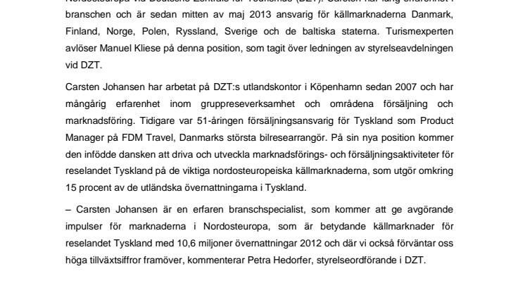 – Carsten Johansen är en erfaren branschspecialist, som kommer att ge avgörande impulser för marknaderna i Nordosteuropa, som är betydande källmarknader för reselandet Tyskland med 10,6 miljoner övernattningar 2012 och där vi också förväntar oss höga tillväxtsiffror framöver, kommenterar Petra Hedorfer, styrelseordförande i DZT.