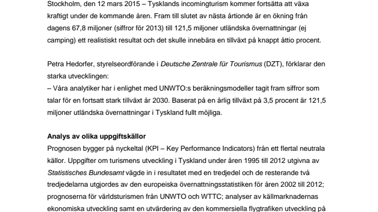 – Våra analytiker har i enlighet med UNWTO:s beräkningsmodeller tagit fram siffror som talar för en fortsatt stark tillväxt år 2030. Baserat på en årlig tillväxt på 3,5 procent är 121,5 miljoner utländska övernattningar i Tyskland fullt möjliga.