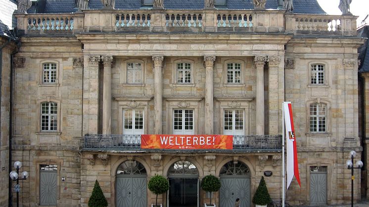 Markgräfliches Opernhaus Bayreuth, fasad med banderollen "Welterbe" (sv. Världsarv). © Bayerische Schlösserverwaltung