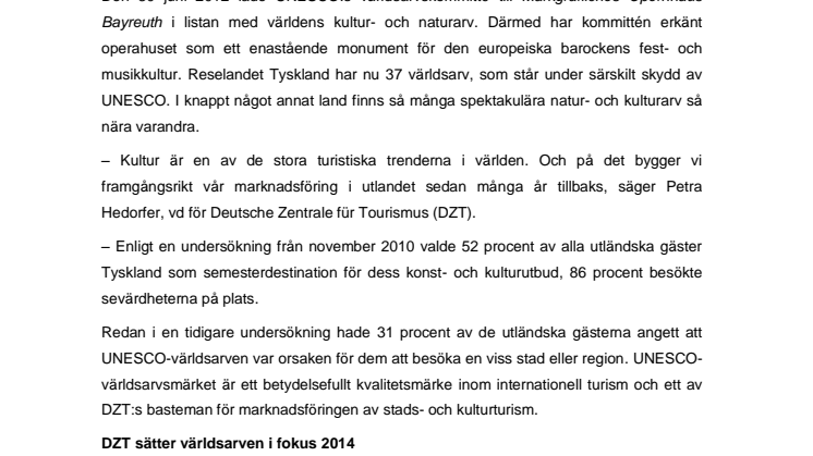 Tyska Turistbyrån/DZT integrerar kontinuerligt de tyska UNESCO-världsarven i sina världstäckande kommunikations- och försäljningsaktiviteter. Mot denna bakgrund kommer temaåret 2014 “UNESCO-världsarv i Tyskland – Natur, städer, minnesmärken“ att förverkligas. På så vis sätts de nu 37 erkända kultur- och naturminnena i särskilt fokus för den breda, internationella allmänheten. Vid sidan om det nyupptagna operahuset i Bayreuth sträcker sig utmärkelserna från Hamburgs Wattenmeer till Bodensjön och från domkyrkan i Köln till Berlins museumsö.
