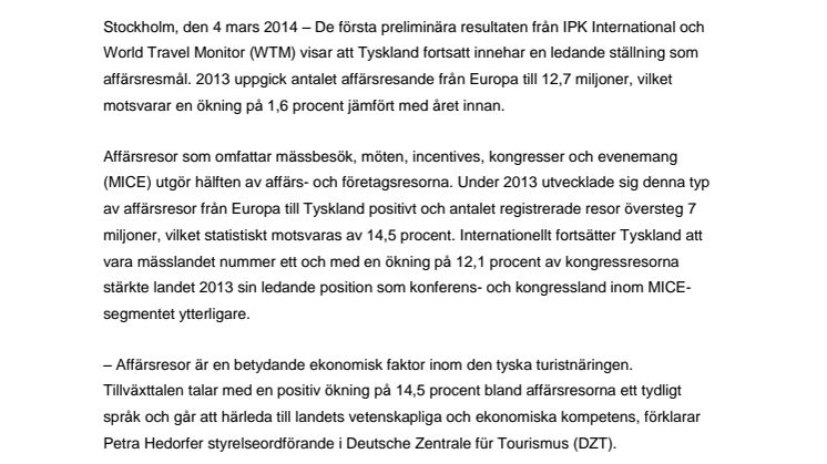 – Affärsresor är en betydande ekonomisk faktor inom den tyska turistnäringen. Tillväxttalen talar med en positiv ökning på 14,5 procent bland affärsresorna ett tydligt språk och går att härleda till landets vetenskapliga och ekonomiska kompetens, förklarar Petra Hedorfer styrelseordförande i Deutsche Zentrale für Tourismus (DZT).