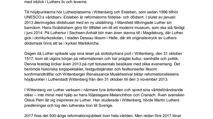 Dagen då Luther spikade upp sina teser på slottskyrkans port i Wittenberg, den 31 oktober 1517, kom att utgöra början på reformationen och har präglat kultur, samhälle och politik. Denna festdag lockar även 2013 på nytt tiotusentals besökare med olika evenemang. Det berömda historiska torgspektaklet, festgudstjänster och festkonserter liksom konfirmandträffar och Wittenberger Renaissance Musikfestival bildar reformationsfestens höjdpunkter i Lutherstadt Wittenberg från den 31 oktober till den 3 november 2013.