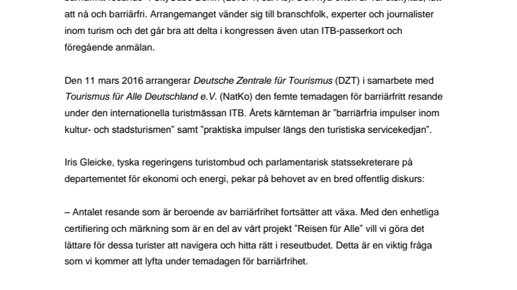 Den 11 mars 2016 arrangerar Deutsche Zentrale für Tourismus (DZT) i samarbete med Tourismus für Alle Deutschland e.V. (NatKo) den femte temadagen för barriärfritt resande under den internationella turistmässan ITB. Årets kärnteman är ”barriärfria impulser inom kultur- och stadsturismen” samt ”praktiska impulser längs den turistiska servicekedjan”.