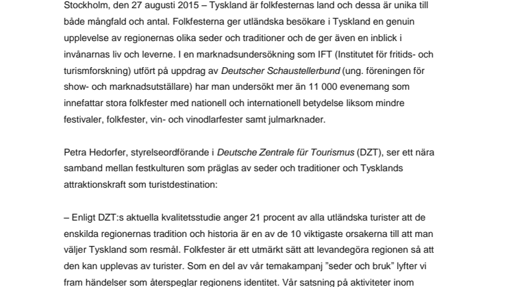 – Enligt DZT:s aktuella kvalitetsstudie anger 21 procent av alla utländska turister att de enskilda regionernas tradition och historia är en av de 10 viktigaste orsakerna till att man väljer Tyskland som resmål. Folkfester är ett utmärkt sätt att levandegöra regionen så att den kan upplevas av turister. Som en del av vår temakampanj ”seder och bruk” lyfter vi fram händelser som återspeglar regionens identitet. Vår satsning på aktiviteter inom sociala medier gör att även yngre resenärer kan uppleva traditioner med historiska rötter.