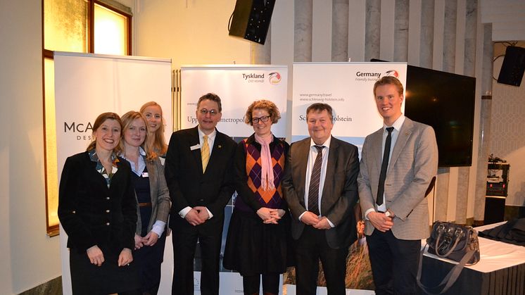 Fr v Iris Müller (Tyska Turistbyrån), Carolina Rhinow (McArthurGlen), Silke Zöllner (Tyska Turistbyrån), Uwe Meistner (Tyska Turistbyrån), Sandra Hencke (TASH/Schleswig-Holsteins turistråd), Bernd Hässler (nordenchef Deutsche Zentrale für Tourismus/DZT), Gustav Svärd (Tyska Turistbyrån).