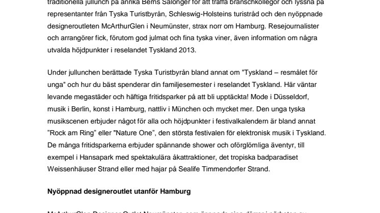 På onsdagen kom 69 gäster till Tyska Turistbyråns traditionella jullunch på anrika Berns Salonger för att träffa branschkollegor och lyssna på representanter från Tyska Turistbyrån, Schleswig-Holsteins turistråd och den nyöppnade designeroutleten McArthurGlen i Neumünster, strax norr om Hamburg. Resejournalister och arrangörer fick, förutom god julmat och fina tyska viner, även information om några utvalda höjdpunkter i reselandet Tyskland 2013.
