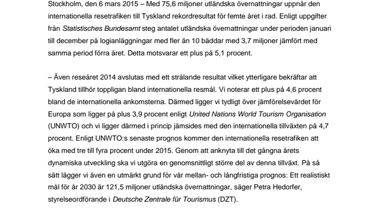 – Även reseåret 2014 avslutas med ett strålande resultat vilket ytterligare bekräftar att Tyskland tillhör toppligan bland internationella resmål. Vi noterar ett plus på 4,6 procent bland de internationella ankomsterna. Därmed ligger vi tydligt över jämförelsevärdet för Europa som ligger på plus 3,9 procent enligt United Nations World Tourism Organisation (UNWTO) och vi ligger därmed i princip jämsides med den internationella tillväxten på 4,7 procent. Enligt UNWTO:s senaste prognos kommer den internationella resetrafiken att öka med tre till fyra procent under 2015. Genom att anknyta till det gångna årets dynamiska utveckling ska vi utgöra en genomsnittligt större del av denna tillväxt. På så sätt lägger vi även en utmärkt grund för vår mellan- och långfristiga prognos: Ett realistiskt mål för år 2030 är 121,5 miljoner utländska övernattningar, säger Petra Hedorfer, styrelseordförande i Deutsche Zentrale für Tourismus (DZT).