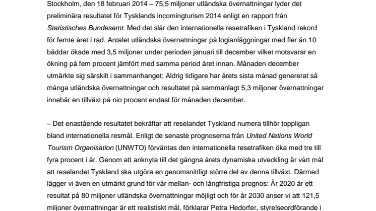 – Det enastående resultatet bekräftar att reselandet Tyskland numera tillhör toppligan bland internationella resmål. Enligt de senaste prognoserna från United Nations World Tourism Organisation (UNWTO) förväntas den internationella resetrafiken öka med tre till fyra procent i år. Genom att anknyta till det gångna årets dynamiska utveckling är vårt mål att reselandet Tyskland ska utgöra en genomsnittligt större del av denna tillväxt. Därmed lägger vi även en utmärkt grund för vår mellan- och långfristiga prognos: År 2020 är ett resultat på 80 miljoner utländska övernattningar möjligt och för år 2030 anser vi att 121,5 miljoner övernattningar är ett realistiskt mål, förklarar Petra Hedorfer, styrelseordförande i Deutsche Zentrale für Tourismus (DZT).