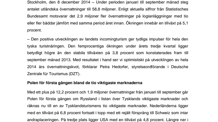 Med ett plus på 12,2 procent och 1,9 miljoner övernattningar från januari till september går Polen för första gången om Ryssland i listan över Tysklands viktigaste marknader och räknas nu till en av Tysklandsturismens tio viktigaste marknader. Nederländerna ligger med en tillväxt på 6,8 procent fortsatt i topp med ett rejält försprång till Schweiz som intar andraplaceringen. På tredje plats ligger USA med en tillväxt på 4,8 procent. Längre ner i rankingen följer Storbritannien (plus 4,2 procent), Italien (plus 5,4 procent) och Österrike (plus 6,0 procent). Utvecklingen på den ryska marknaden är som väntat fortsatt negativ och faller tillbaka på minus 3,9 procent. Från Sverige har 1 347 228 övernattningar registrerats från januari till september, vilket motsvarar en ökning på 1,4 procent jämfört med samma period i fjol.