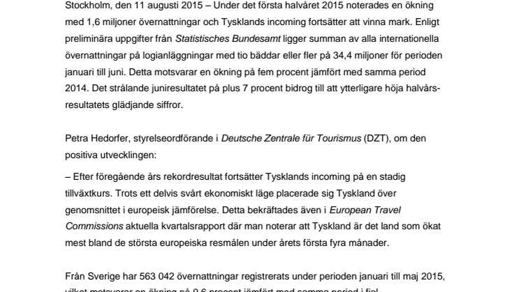 Under det första halvåret 2015 noterades en ökning med 1,6 miljoner övernattningar och Tysklands incoming fortsätter att vinna mark. Enligt preliminära uppgifter från Statistisches Bundesamt ligger summan av alla internationella övernattningar på logianläggningar med tio bäddar eller fler på 34,4 miljoner för perioden januari till juni. Detta motsvarar en ökning på fem procent jämfört med samma period 2014. Det strålande juniresultatet på plus 7 procent bidrog till att ytterligare höja halvårsresultatets glädjande siffror.