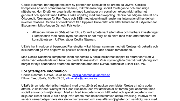 Med Cecilia Näsmans kompetens inom ekonomisk & social hållbarhet kopplat till affärer ser vi att vi stärker vårt erbjudande mot hela den breda finanssektorn. Vi är mycket glada över vår rekrytering som borgar för nya spännande affärer de kommande åren med U&We, framhåller Ellinor Eke, VD.