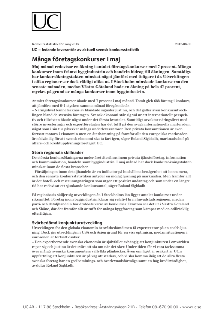 Maj månad redovisar en ökning i antalet företagskonkurser med 7 procent. Många konkurser inom främst byggindustrin och handeln bidrog till ökningen. Samtidigt har konkursökningstakten minskat något jämfört med tidigare i år. Utvecklingen i olika regioner ser dock väldigt olika ut. I Stockholm minskade konkurserna den senaste månaden, medan Västra Götaland hade en ökning på hela 47 procent.