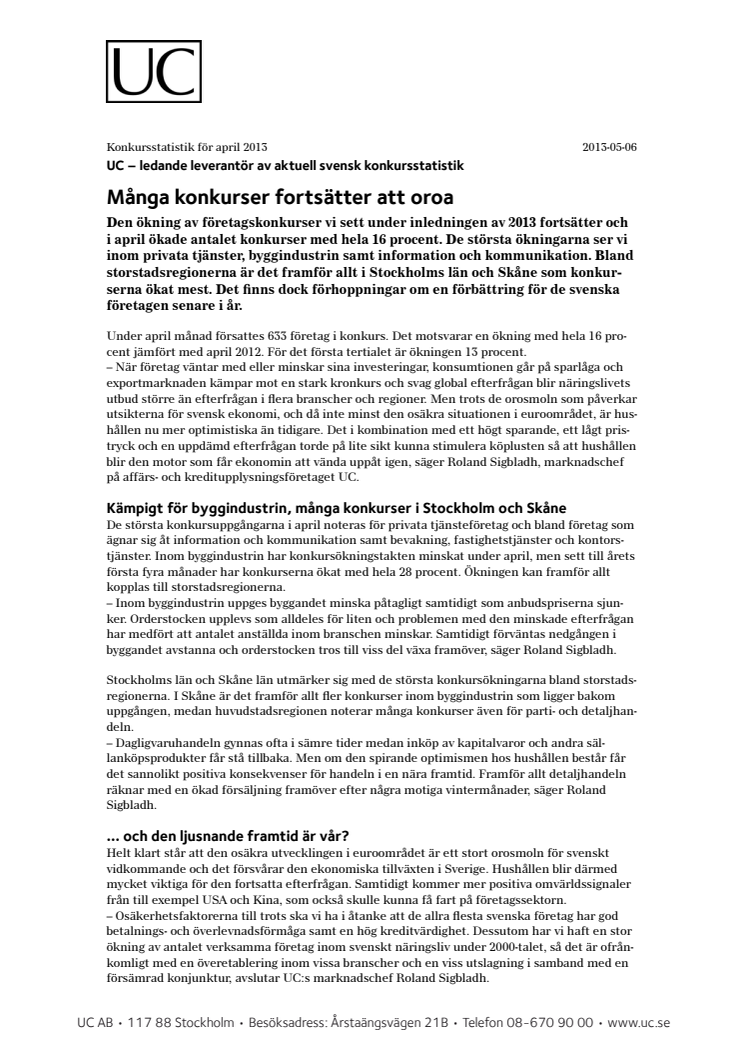 Den ökning av företagskonkurser vi sett under inledningen av 2013 fortsätter. I april ökade antalet konkurser med hela 16 procent. De största ökningarna ser vi inom privata tjänster, byggindustrin samt information/kommunikation. Bland storstadsregionerna är det i Stockholms län och Skåne som konkurserna ökat mest. Det finns dock förhoppningar om förbättringar för de svenska företagen senare i år.