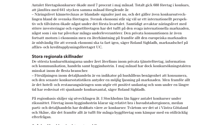 – Näringslivet kännetecknas av blandade signaler just nu, och det gäller även konkursutvecklingen bland de svenska företagen. Svensk ekonomi står sig väl ur ett internationellt perspektiv och tillväxten ökade något under det första kvartalet. Samtidigt avvaktar näringslivet med större investeringar och exportföretagen har det tufft på den svaga internationella marknaden, något som i sin tur påverkar många underleverantörer. Den privata konsumtionen är även fortsatt motorn i ekonomin men en återhämtning på framför allt den europeiska marknaden är nödvändig för att svensk ekonomi ska ta fart igen, säger Roland Sigbladh, marknadschef på affärs- och kreditupplysningsföretaget UC.
