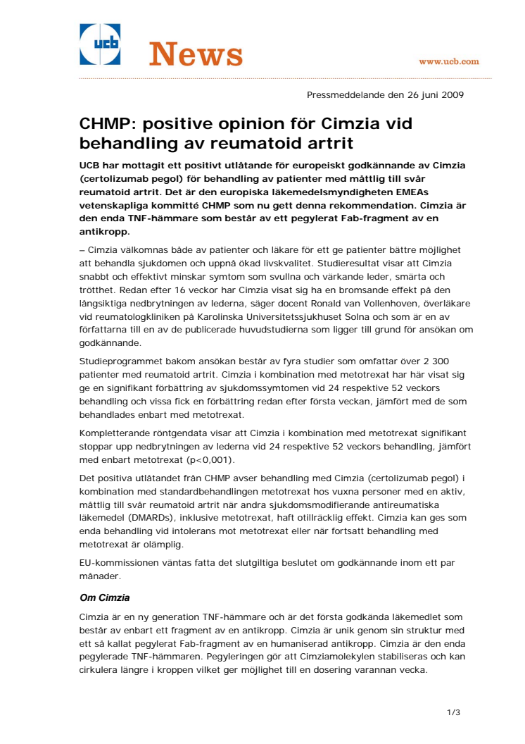 UCB har mottagit ett positivt utlåtande för europeiskt godkännande av Cimzia (certolizumab pegol) för behandling av patienter med måttlig till svår reumatoid artrit. Det är den europiska läkemedelsmyndigheten EMEAs vetenskapliga kommitté CHMP som nu gett denna rekommendation. Cimzia är den enda TNF-hämmare som består av ett pegylerat Fab-fragment av en antikropp.