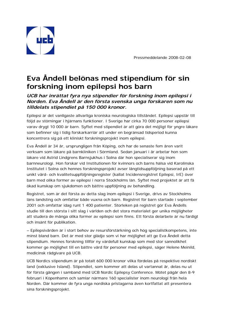UCB har inrättat fyra nya stipendier för forskning inom epilepsi i Norden. Eva Åndell är den första svenska unga forskaren som nu tilldelats stipendiet på 150 000 kronor.