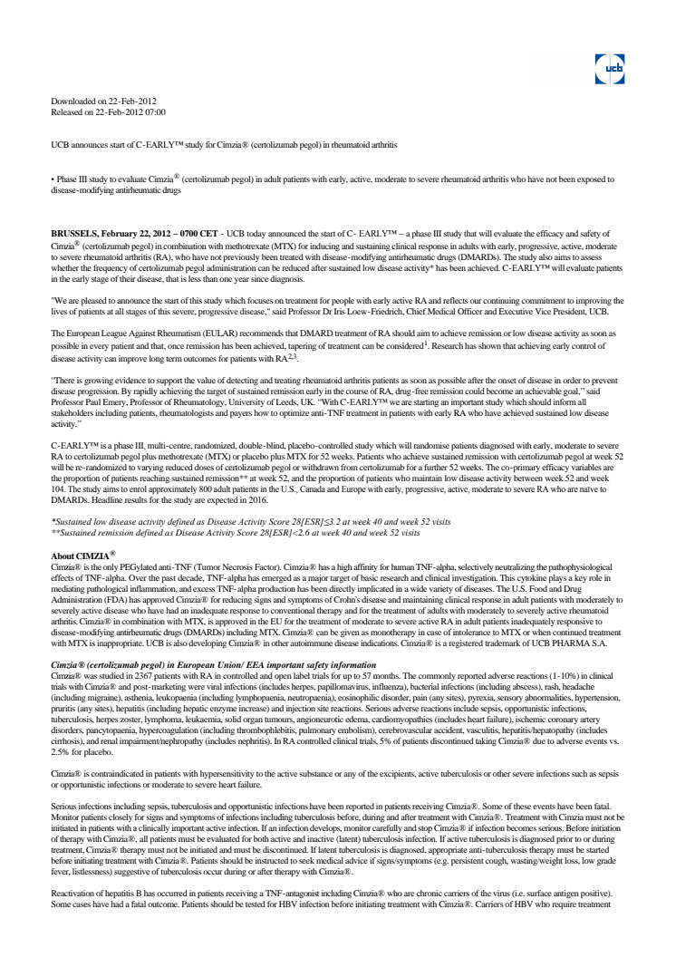 UCB announces start of C-EARLY™ study for Cimzia® (certolizumab pegol) in rheumatoid arthritis