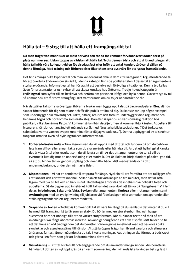 Då man frågar vad människor är mest nervösa och rädda för kommer förvånansvärt döden först på plats nummer sex. Listan toppas av rädslan att hålla tal. Trots denna rädsla och att vi ibland tvingas att hålla tal inför våra kollegor, vid en födelsedagsfest eller inför kunder, så övar vi sällan på denna förmåga. Med träning och förberedelser ökar chanserna avsevärt för ett lyckat framträdande.