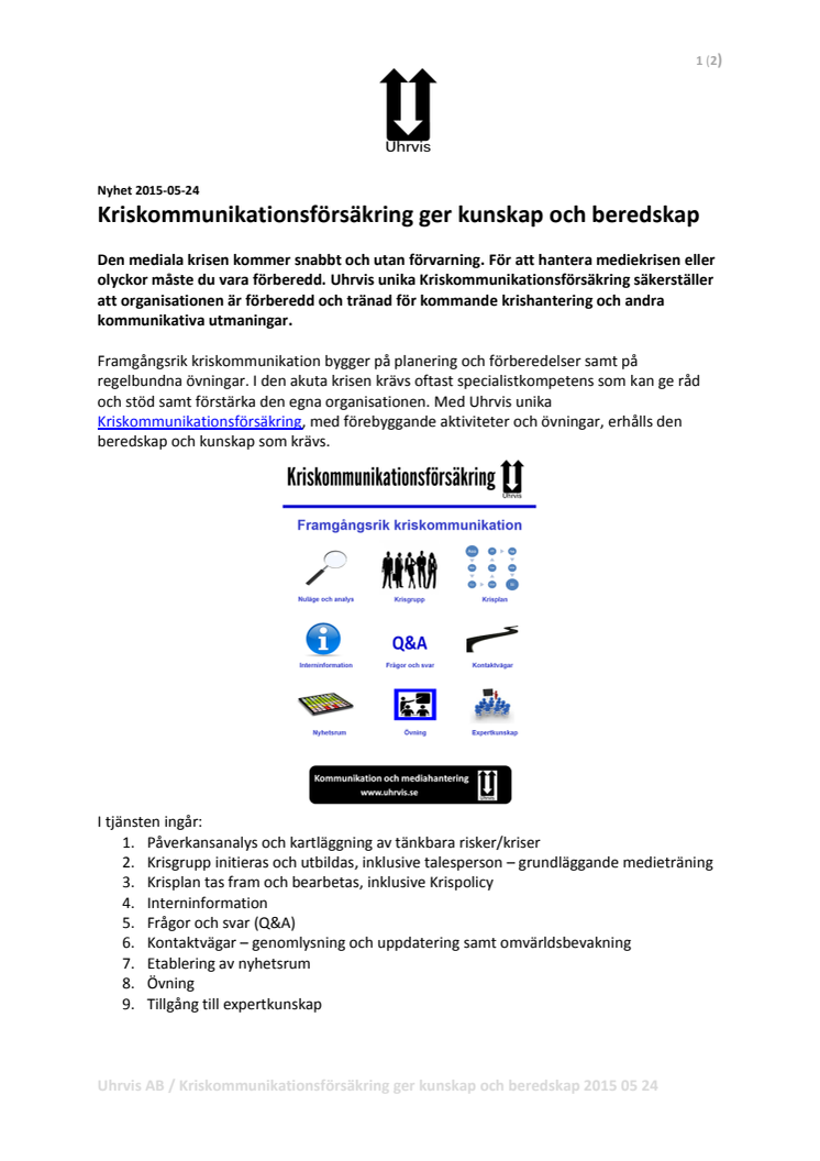Den mediala krisen kommer snabbt och utan förvarning. För att hantera mediekrisen eller olyckor måste du vara förberedd. Uhrvis unika Kriskommunikationsförsäkring säkerställer att organisationen är förberedd och tränad för kommande krishantering och andra kommunikativa utmaningar.