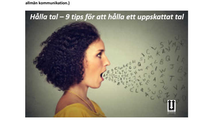Vid studier av vad vi människor är rädda för är resultatet intressant. Döden kommer oftast på plats 5-7. Det som oftast toppar listan är skräcken för att hålla tal inför publik. Vi övar sällan upp denna förmåga, trots att vi ibland tvingas att hålla tal inför ett antal kunder, inför våra kollegor, vid en födelsedagsfest eller vid ett bröllop. Med träning och några enkla hållpunkter blir ditt tal en succé. Uhrvis ger dig 9 tips för ditt nästa tal. (Uhrvis är specialister på Kriskommunikation. Vi hjälper företag i den akuta mediekrisen och i det förebyggande arbetet, både genom rådgivning och operativa uppdrag samt med PR och allmän kommunikation.)