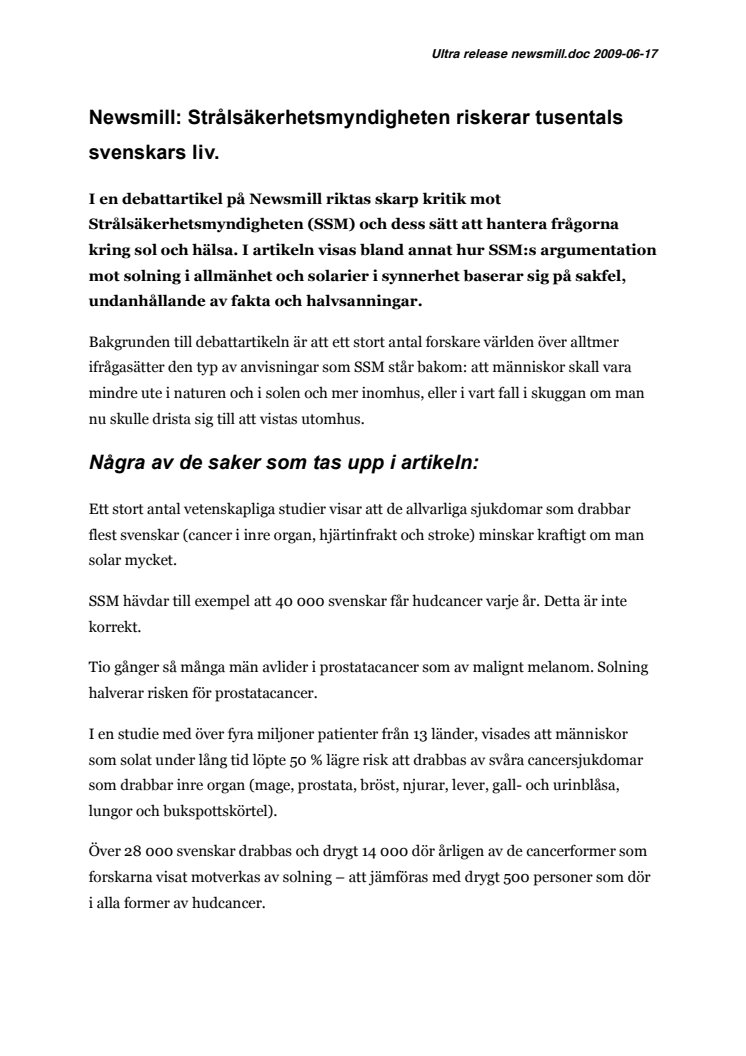 I en debattartikel på Newsmill riktas skarp kritik mot Strålsäkerhetsmyndigheten (SSM) och dess sätt att hantera frågorna kring sol och hälsa. I artikeln visas bland annat hur SSM:s argumentation mot solning i allmänhet och solarier i synnerhet baserar sig på sakfel, undanhållande av fakta och halvsanningar.