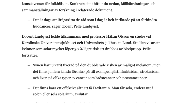 Docent Lindqvist ledde tillsammans med professor Håkan Olsson en studie vid Karolinska Universitetssjukhuset och Universitetssjukhuset i Lund. Studien visar att kvinnor som solar mycket löper 30 % lägre risk att drabbas av blodpropp. Pelle fortsätter: