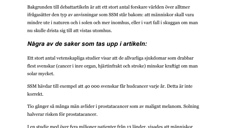 Bakgrunden till debattartikeln är att ett stort antal forskare världen över alltmer ifrågasätter den typ av anvisningar som SSM står bakom: att människor skall vara mindre ute i naturen och i solen och mer inomhus, eller i vart fall i skuggan om man nu skulle drista sig till att vistas utomhus.