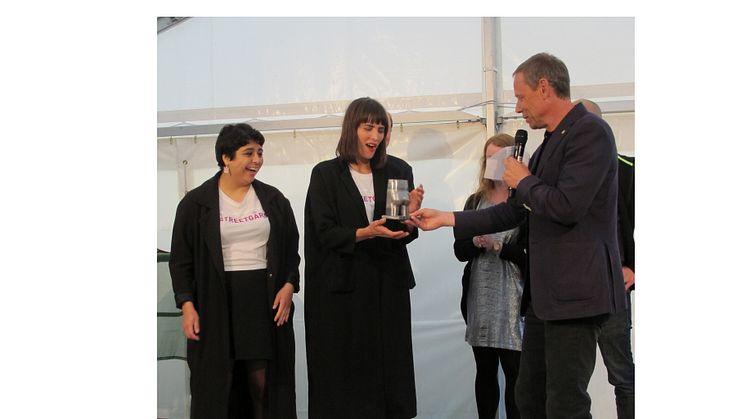 Emelie Roslund och Mona Abbasnejad från Street Gäris tog emot priset på Näringslivets Trädgård i Visby där de uttryckte sin glädje och förvåning över att bli lyfta och peppade av stålindustrin: