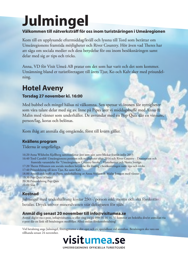 Torsdagen den 27 november kl. 17:40 äger utdelning av årets turismpriser i Umeåregionen rum på Hotel Aveny, Rådhusesplanaden.