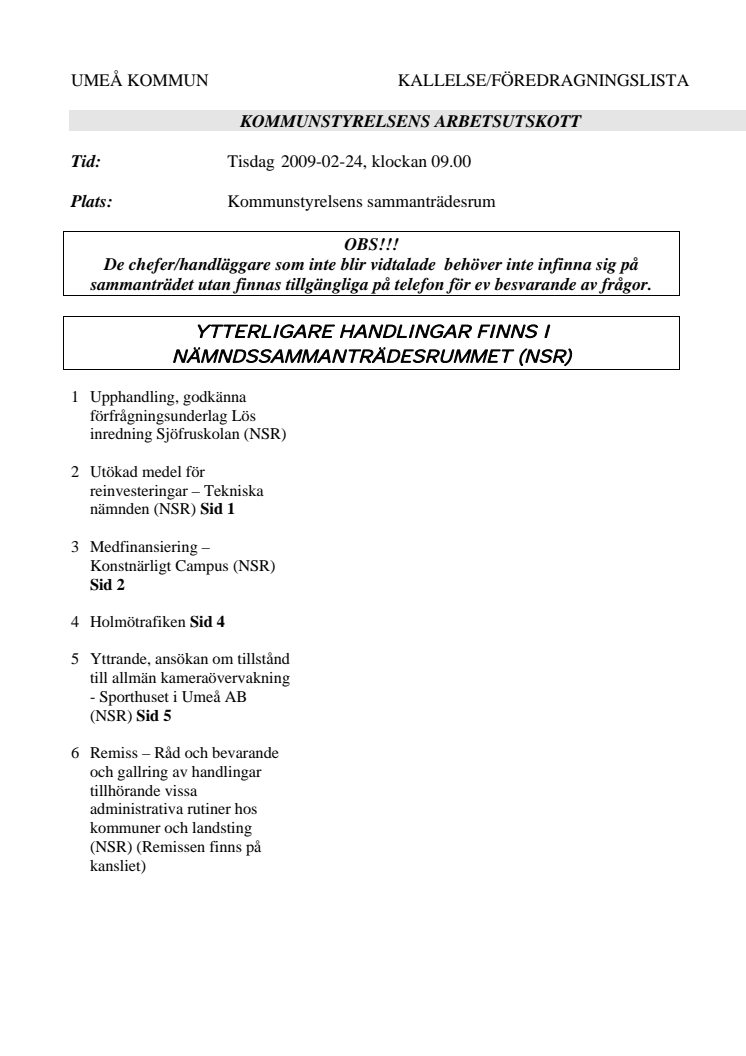 KALLELSE/FÖREDRAGNINGSLISTA KOMMUNSTYRELSENS ARBETSUTSKOTT