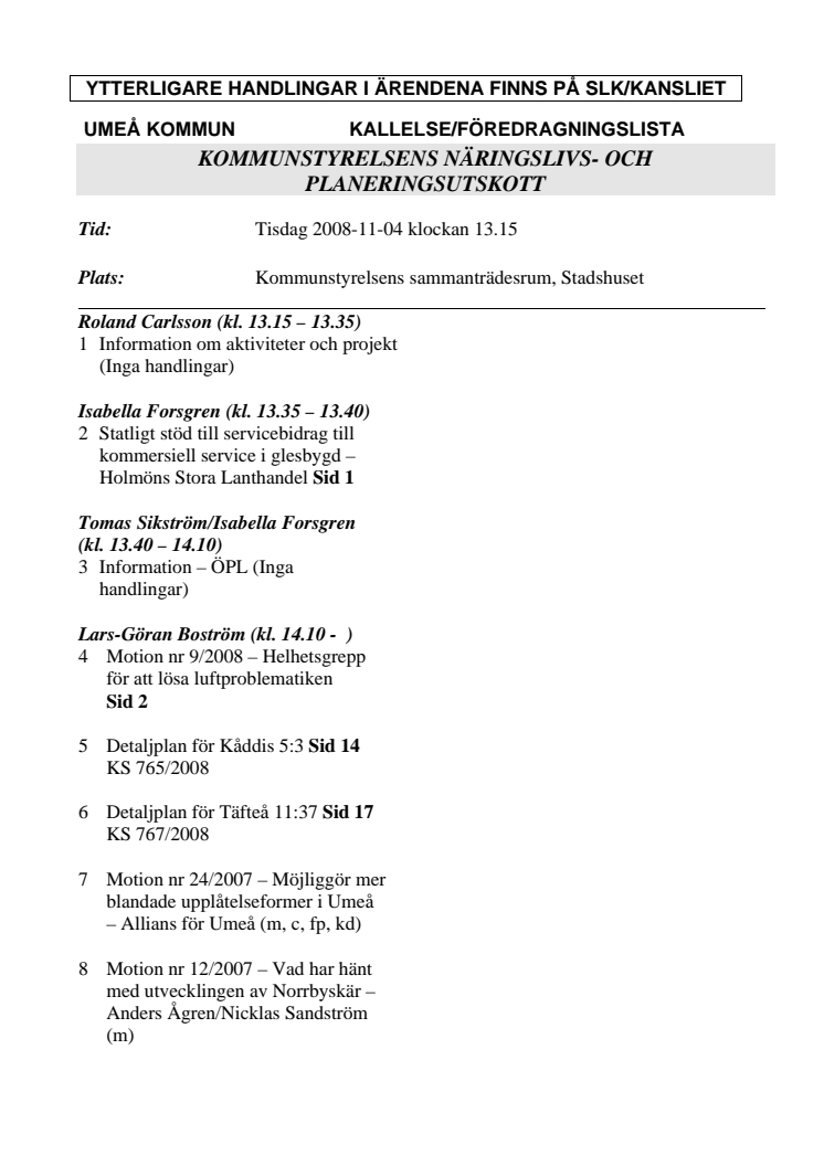 KALLELSE/FÖREDRAGNINGSLISTA KOMMUNSTYRELSENS NÄRINGSLIVS- OCH PLANERINGSUTSKOTT