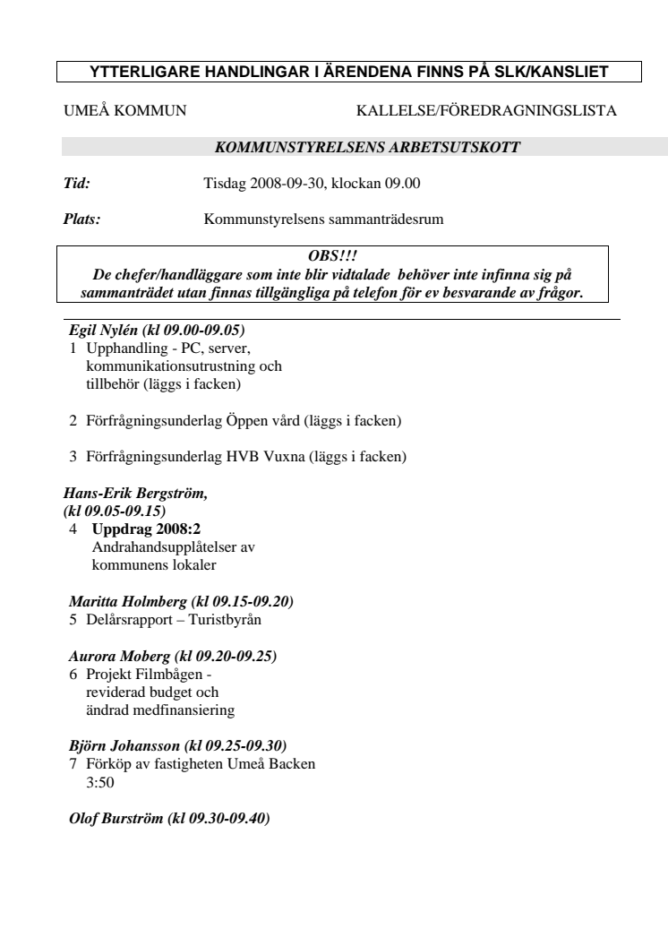 KALLELSE/FÖREDRAGNINGSLISTA KOMMUNSTYRELSENS ARBETSUTSKOTT