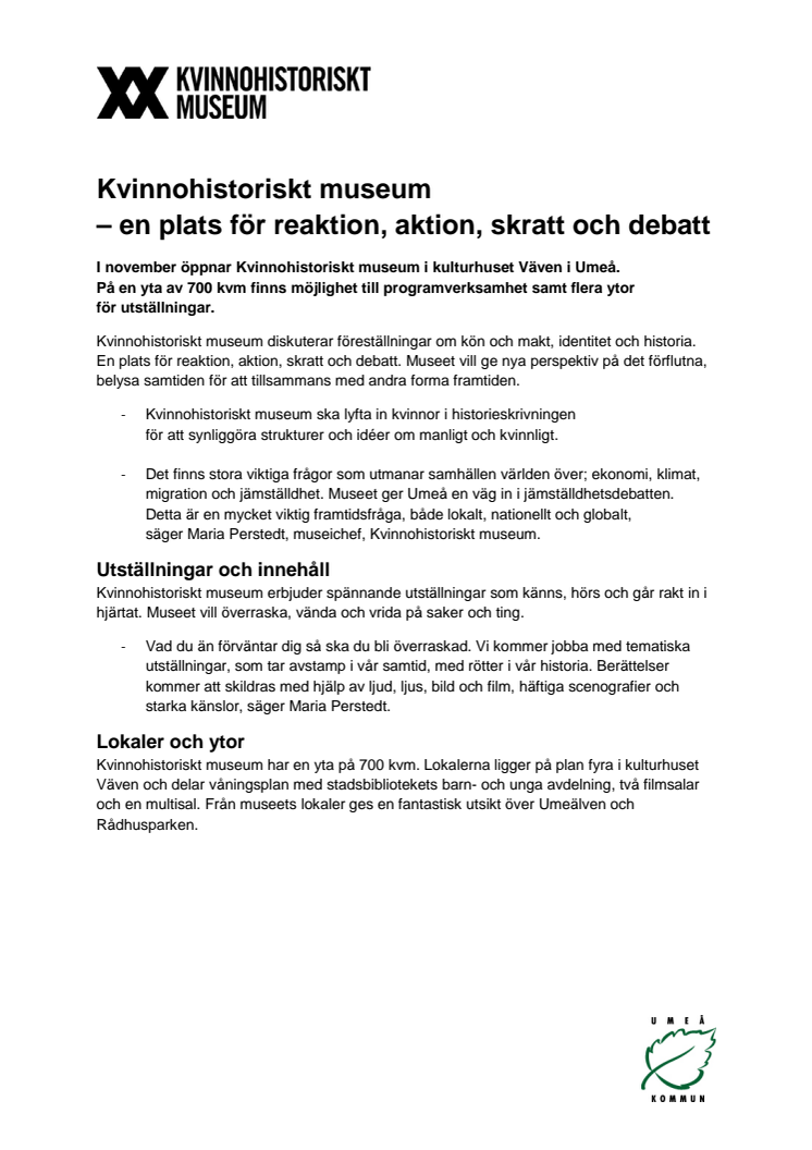I november öppnar Kvinnohistoriskt museum i kulturhuset Väven i Umeå. På en yta av 700 kvm finns möjlighet till programverksamhet samt flera ytor för utställningar.