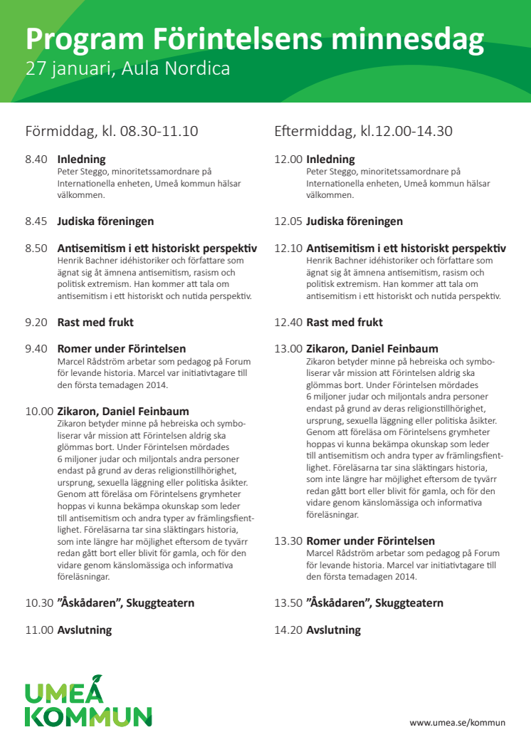 Dokument - 24 Januari 2017 Program Förintelsens dag go to media item Licens: © All rights reserved (nedladdning tillåten) Filformat: .pdf Ladda ner Ämnen Lokal/regional påverkan Utbildning Politik Kommunal service Statlig, kommunal förvaltning Regioner Umeå