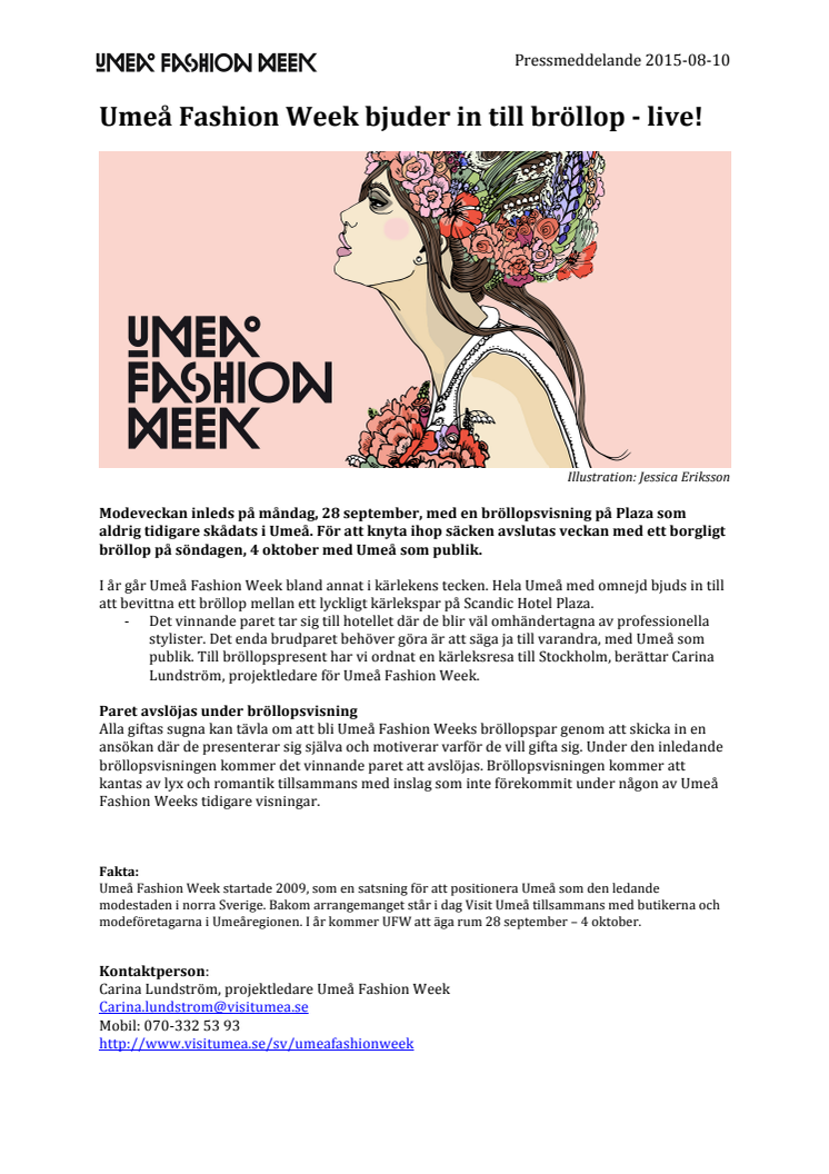 Modeveckan inleds på måndag, 28 september, med en bröllopsvisning på Plaza som aldrig tidigare skådats i Umeå. För att knyta ihop säcken avslutas veckan med ett borgligt bröllop på söndagen, 4 oktober med Umeå som publik.