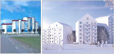Tidigare samt aktuellt förslag till bebyggelse. Illustrationerna visar byggnaderna sedda från korsningen Älgvägen/ Mariehemsvägen.