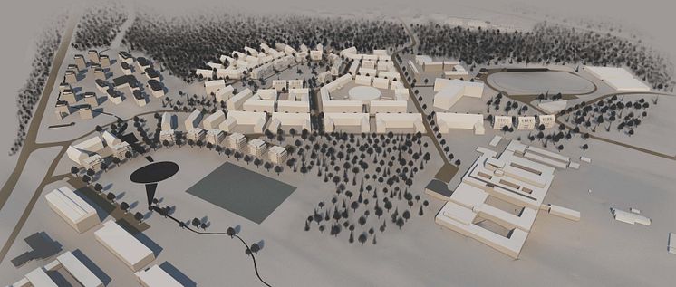 Vy från sydväst. Visar förslag på ny bebyggelse på Lilljansberget och del av campusområdet.