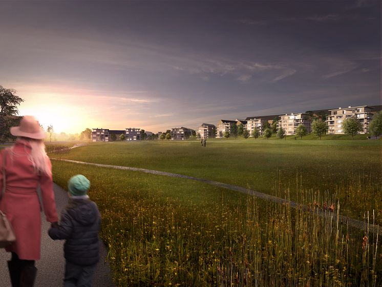 Vy från söder. Visar förslag på bebyggelse och ny utformning i norra delen av campusparken. Den nya bebyggelsen ramar in parken och skapar rumslighet i det tidigare ganska odefinierade landskapet/området samtidigt som det skapar ett tydligt avslut på campusområdet. Området ska fortsatt utgöra ett gemensamt parkrum för studenter, boende och besökare.