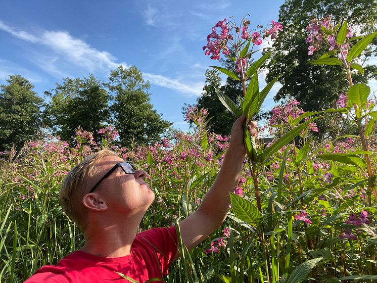 Jättebalsaminen blir hög och bildar ofta stora marktäckande bestånd. Foto: Naturvårdsverket