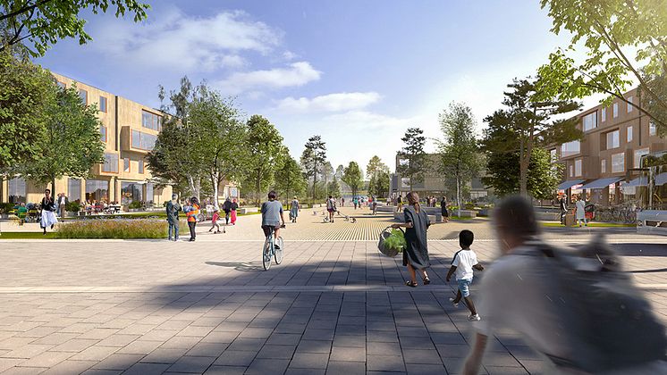 Illustration av blivande Sjötorget på Tomtebo strand i Umeå.
