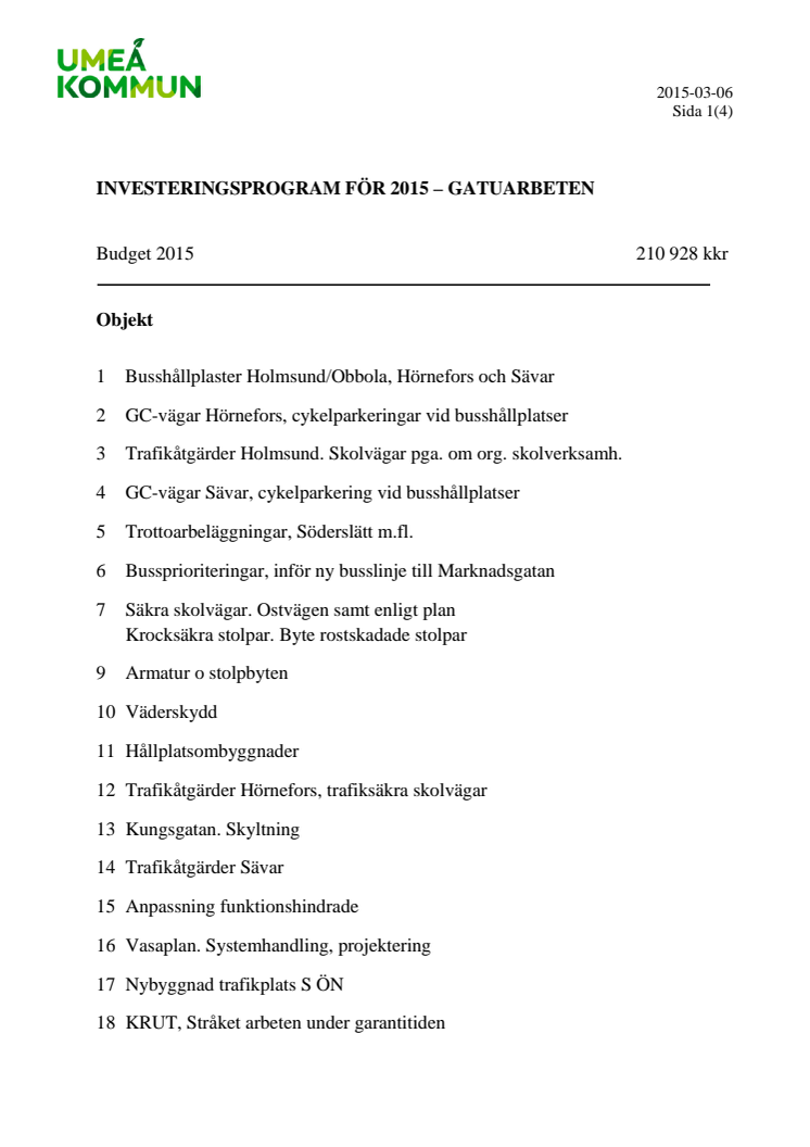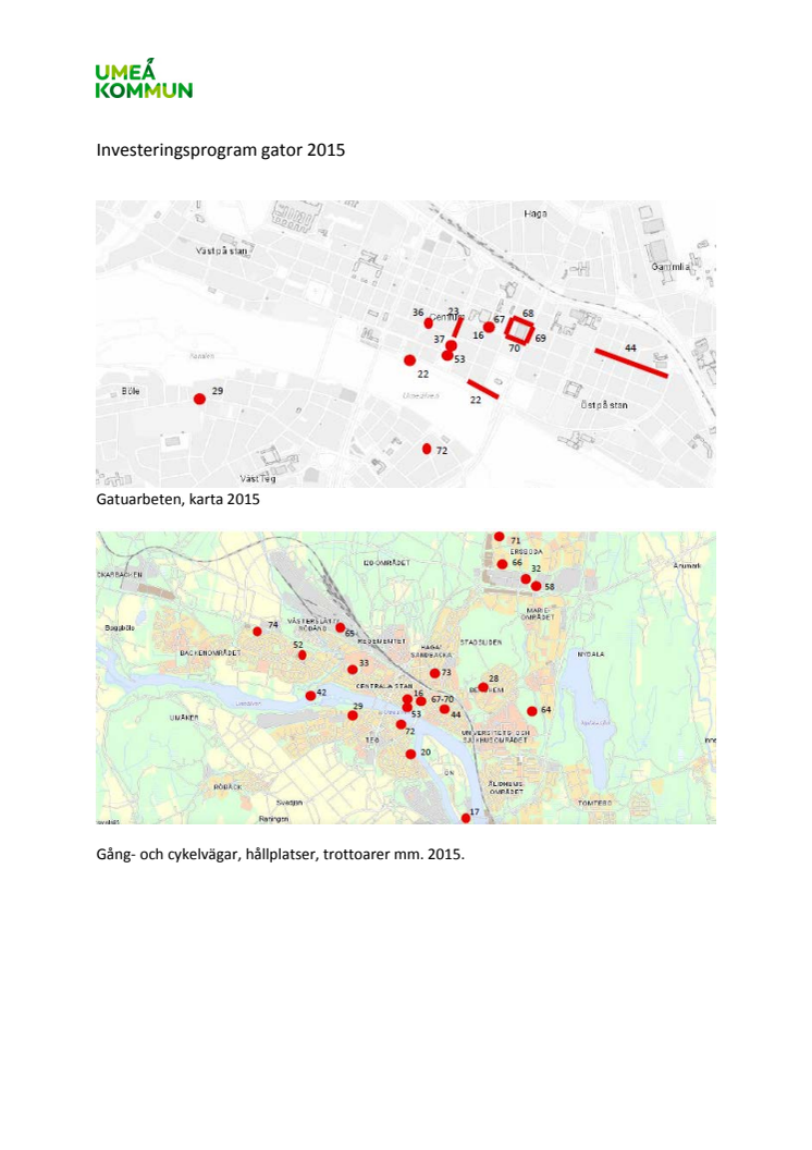 Umeå kommun planerar gatuarbeten för sammanlagt 211 miljoner kronor under 2015. Cirka hälften av är pågående projekt som pågår under flera års tid. Till exempel Vasaplan, Rådhustorget och färdigställande av Nygatan. Investeringsprogrammet har beslutats av tekniska nämnden.